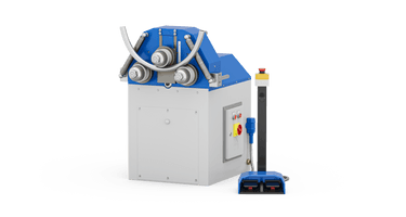 A roller tube bending machine bends cylindrical profiles along circular arcs, using a specific bending angle or radius. In the double-angle version, the lower rollers are adjustable and define the inlet and outlet bending radius, while the central roller remains fixed.